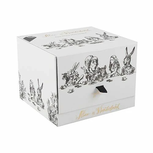 Portraying the well-known Mad Hatter’s Tea Party in hand drawn illustrations with luxury gold decal including the words ‘we’re all mad here’.