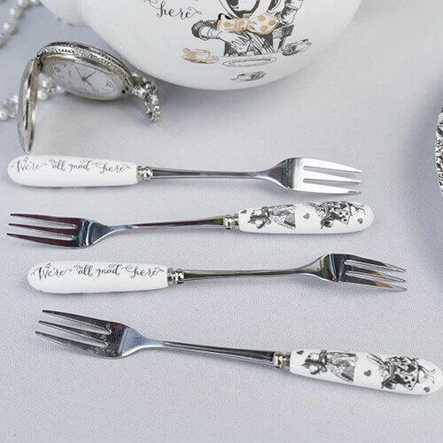 The handles are decorated in beautifully hand drawn illustrations, featuring the Queen of Hearts and the White Rabbit and features the quote ‘we’re all mad here’.