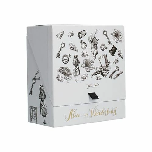 Characters such as the Mad Hatter, the White Rabbit and Alice herself all features with pockets watches, top hats, cake stands and ‘Drink Me’ bottles.