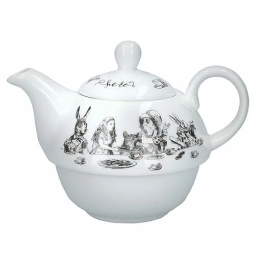 This tea for one set features a black and white hand-drawn illustration of Alice at the Mad Hatter’s tea party and is embellished with gold decal for a touch of added luxury.