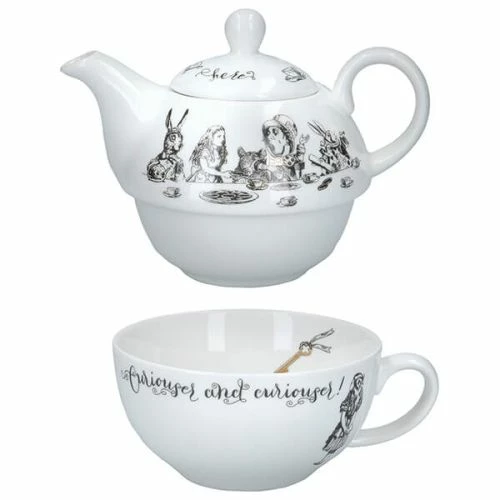 The lid of the teapot features the iconic quote ‘We’re all mad here’, whilst the teacup features the quote ‘Curiouser and curiouser’.