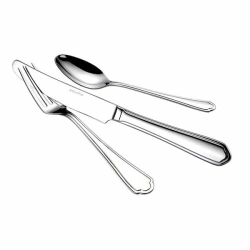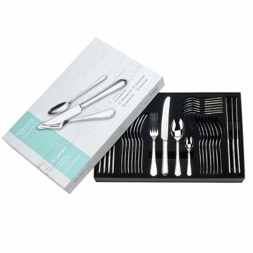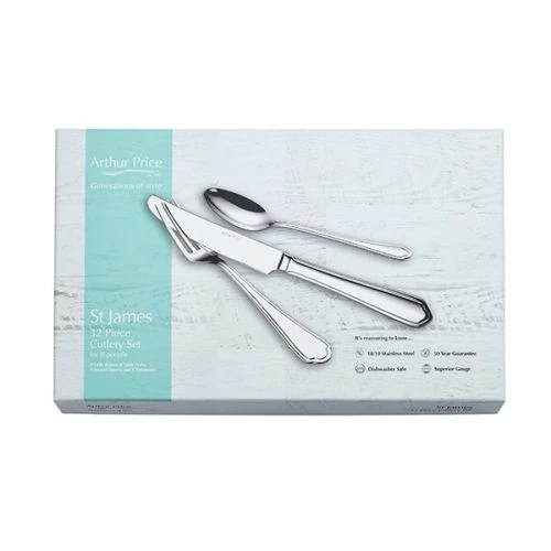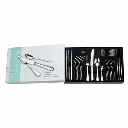This Arthur Price St James 32 piece, 8 person cutlery set, contains: 8x table knives, 8x table forks, 8x dessert spoons and 8x teaspoons. Crafted from 18/10 stainless steel, the Arthur Price St James 32 piece Cutlery Set is dishwasher safe.