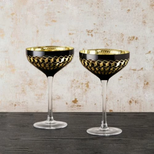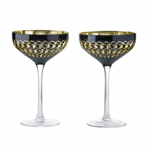 The Artland Cubic Champagne Saucers are a statement set of glasses with a contemporary 3D geometric design adorned on the bowl of the glass to add flare .