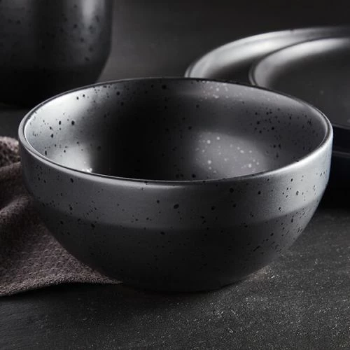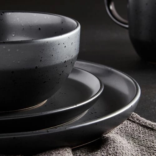 The Barbary & Oak Luna 16 piece dinnerware set is styled with a contemporary design and made for durable stoneware. The finish features a semi-matte speckled black finish.