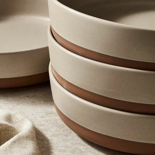 The Barbary & Oak Verona stone set of 4 pasta bowls are crafted from sustainable and natural terracotta. Long lasting and durable with a stone coloured glaze part covering each piece.