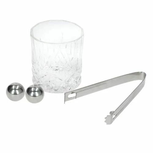 This 4 piece BarCraft whiskey set comes complete with a glass whisky tumbler, two stainless steel ice balls and a pair of stainless steel tongs.