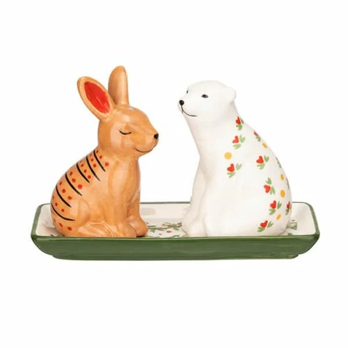 The Cath Kidston Ceramic Christmas Salt and Pepper Shaker Set is an adorable addition to any kitchen, sitting proud and pretty on the worktop or dining table. Made in the shape of a rabbit and a polar bear with pretty patterns across their back, these shakers sit on a tray with a Christmas garland design for an elegant style. They bring a whimsical element to your table setting.