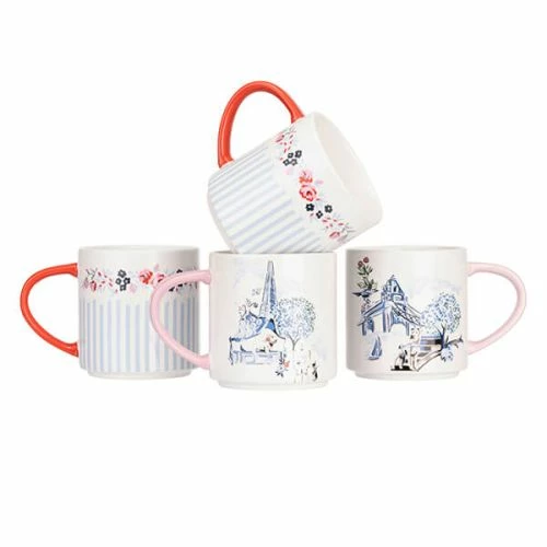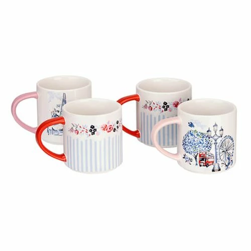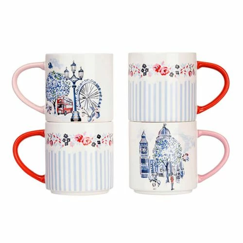 The Cath Kidston London Set of 4 Stacking Mugs bring a colourful flair to your crockery collection with their blue, pink and red colour palette and unique designs. Two cups have a simple yet charming striped pattern with a garland on pretty flowers round the rim, and the other two mugs have iconic London landmarks on them, including Big Ben and London Bridge. Their stackable design makes storage super easy and convenient, and their beautifully unique design captures the classic Cath Kidston theme.