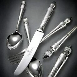 The set includes 12 table knives, 12 table forks, 12 dessert spoons, 12 dessert knives, 12 dessert forks, 12 soup spoons, 12 teaspoons, 12 coffee spoons, 12 fish knives, 12 fish forks, 4 tablespoons and 1 caviar spoon.
