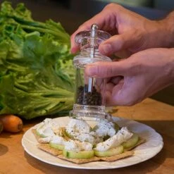 The clear acrylic design allows you to easily check on the level of peppercorns inside the mill and the grind can be adjusted from fine to coarse by loosening or tightening the knob on the lid.