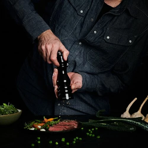 The grind can be easily adjusted from fine through to coarse simply by turning the knob on the top of the mill. Select a fine grind for a big punch in soups and sauces or select a coarser grind for a subtler, but longer lasting taste – great for steaks and salads. The design registered Precision+ carbon steel mechanism strips peppercorns instead of crushing them to ensure maximum flavour is released at every turn.