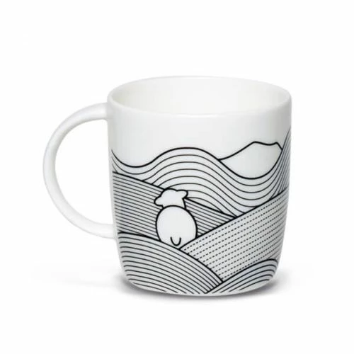This Herdy line mug is inspired by historic graphite mining in the lake district. The fine bone china mug has a striking black and white pattern of Herdy amongst the landscape of the cumbrian fells.