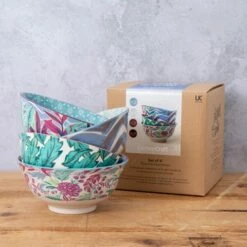 The set of 4 bowls have mix and match designs in a variety of bold and beautiful colours in a durable ceramic stoneware and gift boxed for a great gift for family and friends.