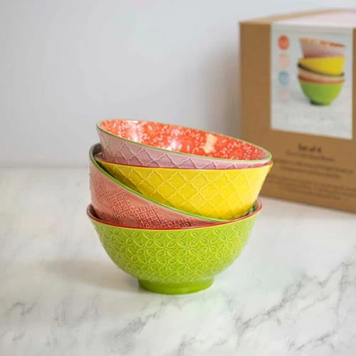 This set of 4 KitchenCraft ‘brights’ stoneware bowls feature modern textures, colours and patterns that certainly stand out in any kitchen.