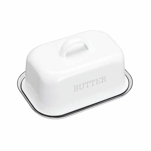 The Butter Dish is made from strong steel dipped in enamel for a durable finish, the stylish grey trim is a lovely detail and runs throughout the collection of mugs, plates and dishes.