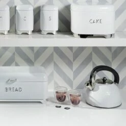 Lovello Retro Ice White Textured 2.5L Whistling Ketlle features a textured finish with small geometric hexagons pressed in to the stainless steel surface.