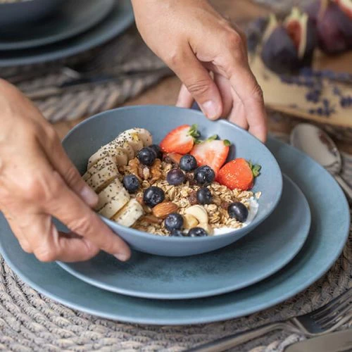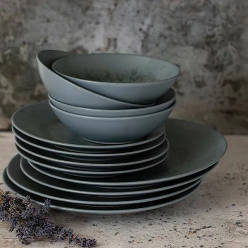 The Mikasa Reactive Blue 12 piece stoneware dinner set features an unique reactive blue glaze which results in a stunning mottled look.