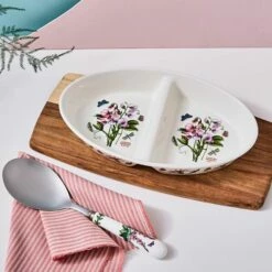 This Portmeirion Botanic Garden Divided Dish is ideal for serving vegetables, potatoes and roasted meats to your table setting. Featuring a floral motif on each half with fluttering butterflies.