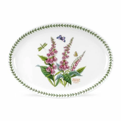 This Portmeirion Botanic Garden Oval Platter is ideal for presenting your spreads like sandwiches, antipasti and hot dishes with style. Featuring a large foxglove floral motif with butterflies and the signature green edging.