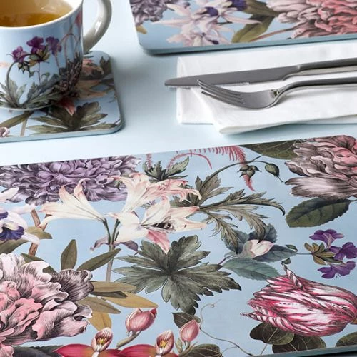 This Bee Floral Placemat Set of 4 exhibits a vibrant sky-blue background contrasted with elegant flora making for a pleasant summer scene.