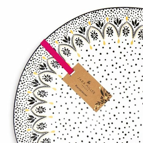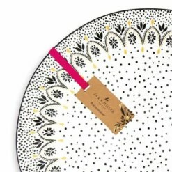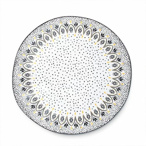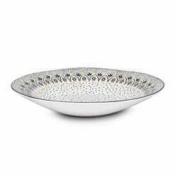 The Sara Miller Artisanne Noir Large Serving Bowl in Mandala brings a Middle Eastern flare to your dining room with a beautiful, unique, paisley design, decorated in a monochrome palette with gold detailing for a truly unique style.