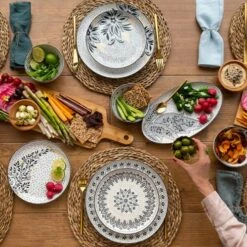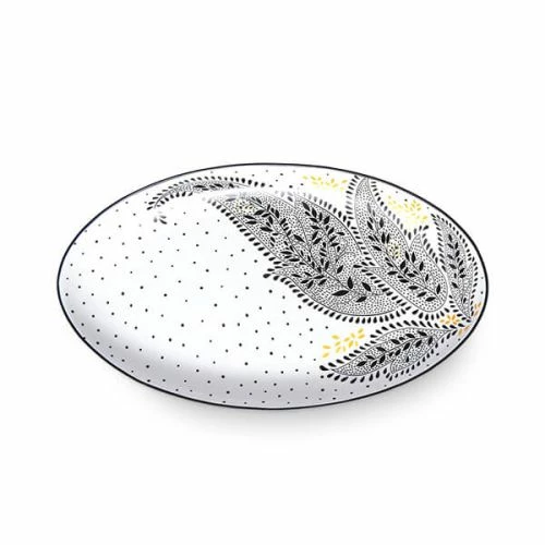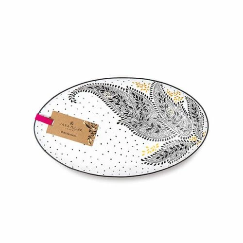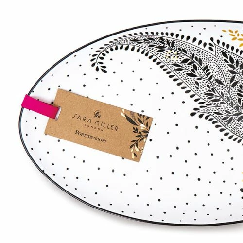 The Sara Miller Artisanne Noir Medium Oval Serving Platter in Paisley brings a Middle Eastern flare to your dining room with a beautiful, unique, paisley design, decorated in a monochrome palette with gold detailing for a truly unique style.