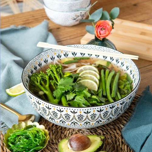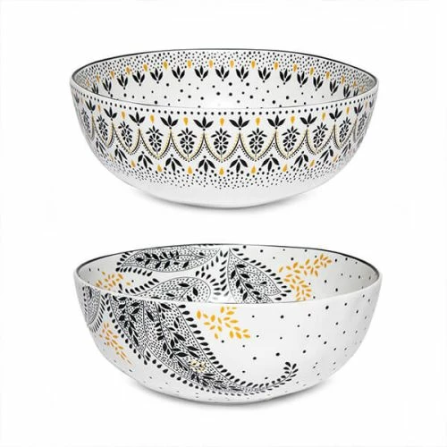 The Sara Miller Artisanne Noir Set of 2 Large Bowls brings a Middle Eastern flare to your dining room with beautiful, unique, mix-and-match designs. These bowls are decorated in a monochrome palette with gold detailing for a truly unique style.