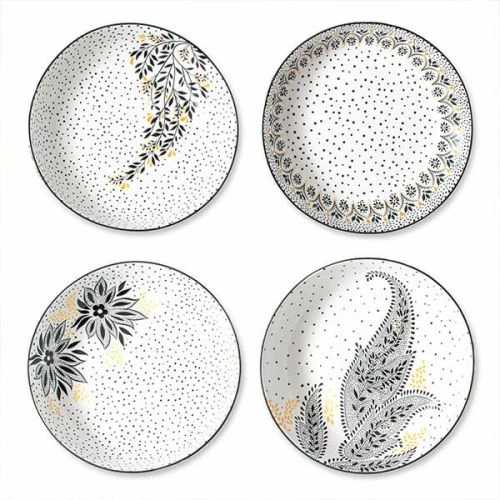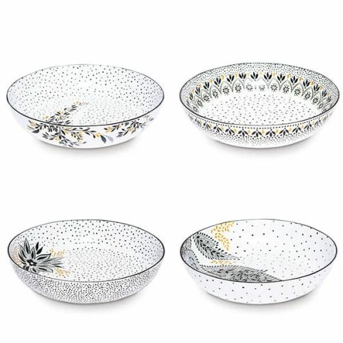 The Sara Miller Artisanne Noir Set of 4 Medium Bowls bring a Middle Eastern flare to your dining room with beautiful, unique, mix-and-match designs. These bowls are decorated in a monochrome palette with gold detailing for a truly unique style.