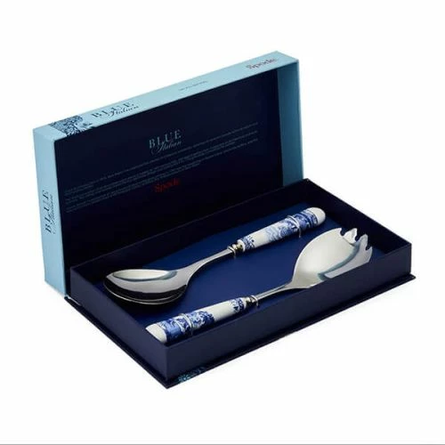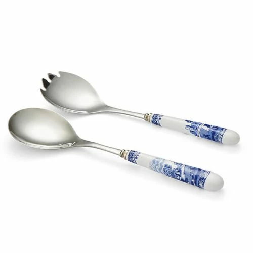 The Spode Blue Italian Salad Servers are a lovely addition to your table setting when serving delicious summer salads. The pair contains one spoon shaped server, and the other is spoon shaped with fork prongs for ease of use. The design on the handles of these servers captures a historic scene inspired by the Italian countryside with an Oriental border that dates back to the 18th century.
