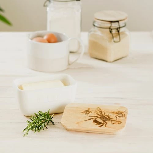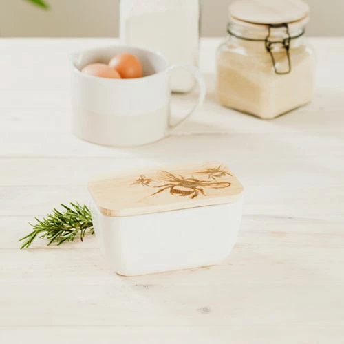 Add a homely countryside touch to the kitchen with the Just Slate Company Bee White Butter Dish. This stylish ceramic and oak butter dish enables butter to be served at the perfect temperature. To ensure freshness, the wooden lid includes a seal. The oak lid is also engraved with a bevy of buzzing bees.
