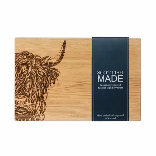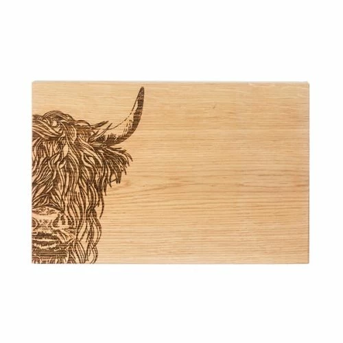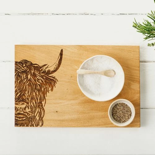 An eye catching and shaggy, hand illustrated highland cow is engraved on this serving board which would make a delightful gift, either as a wedding or housewarming present.