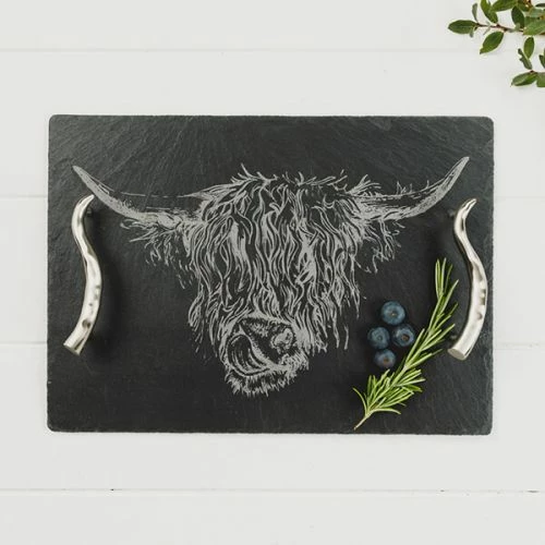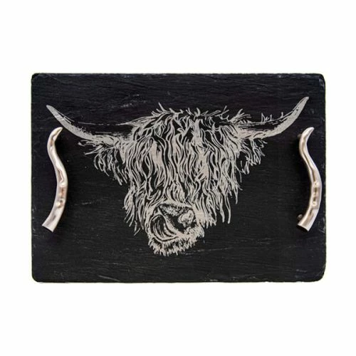 This high quality slate serving tray has been handcrafted in Scotland and is engraved with a shaggy and loveable highland cow.