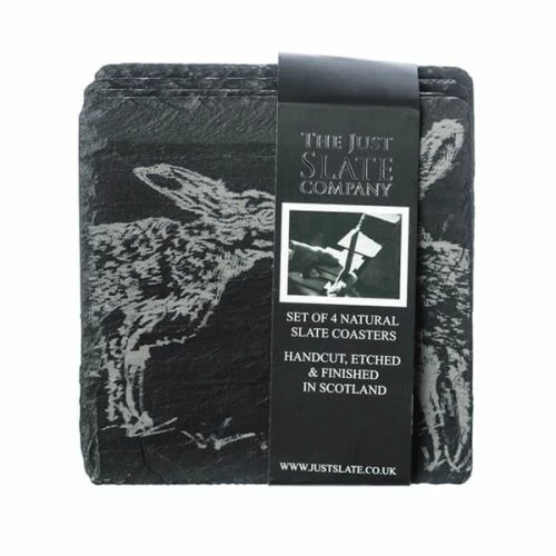 Beautifully handcrafted in Scotland, the Just Slate Company Set of 4 Kissing Hares Slate Coasters make a lovely table piece for your guests to set their drinks on. Each square slate coaster has been engraved with a stunning hand-illustrated engraving of a pair of kissing rabbits.