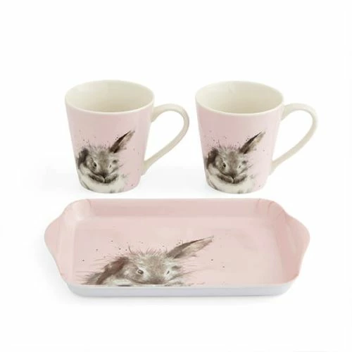 The set features a cute Hannah Dale illustration of a fluffy bunny on a soft pink background and includes two porcelain mugs and a melamine tray.